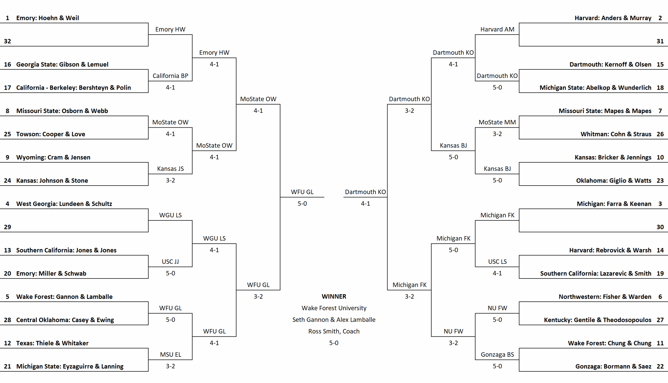 - Harvard: Tripp Rebrovick & Jonathan Warsh (6-2, 16)