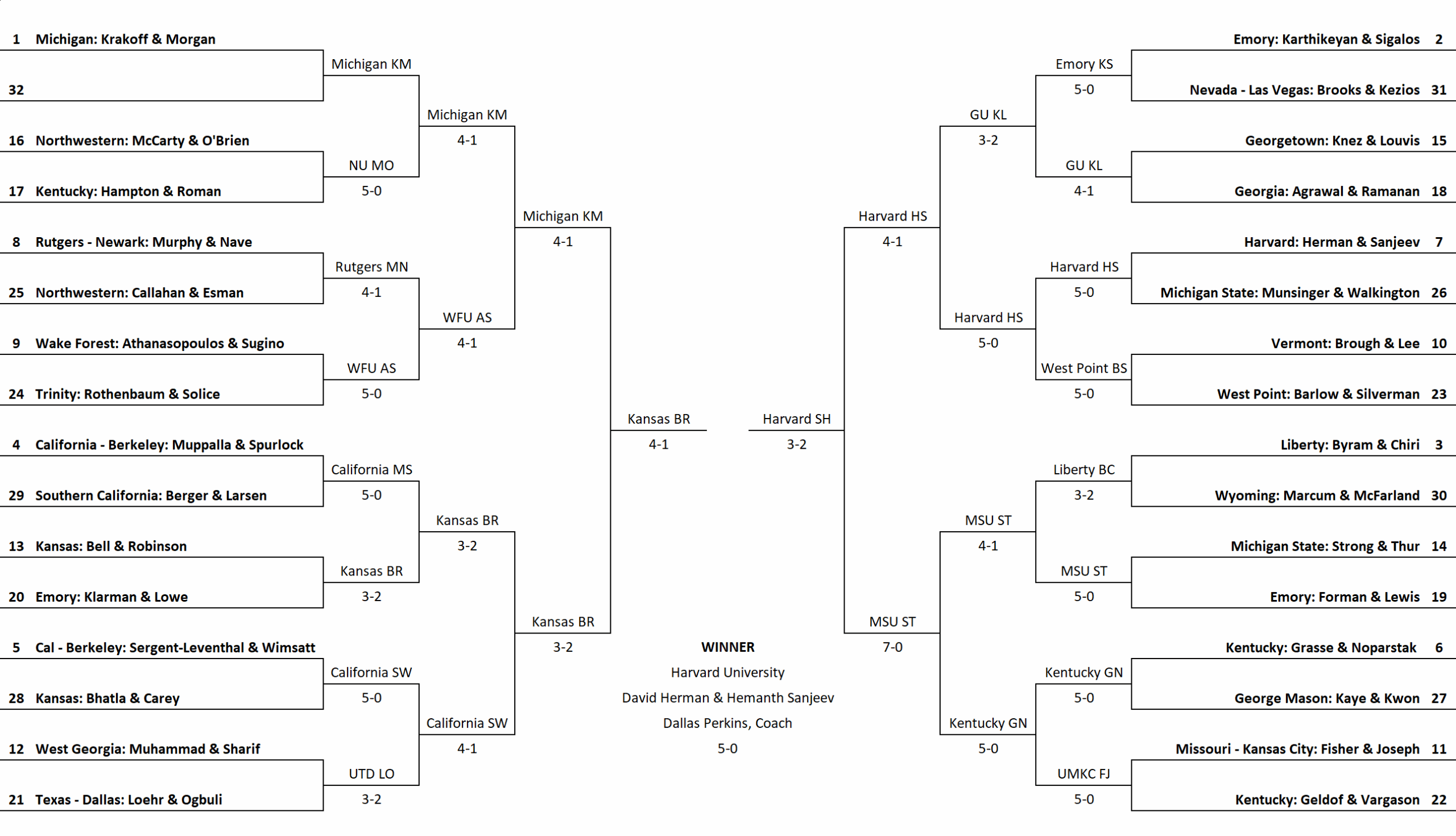- Harvard: David Herman & Hemanth Sanjeev (6-2, 17)