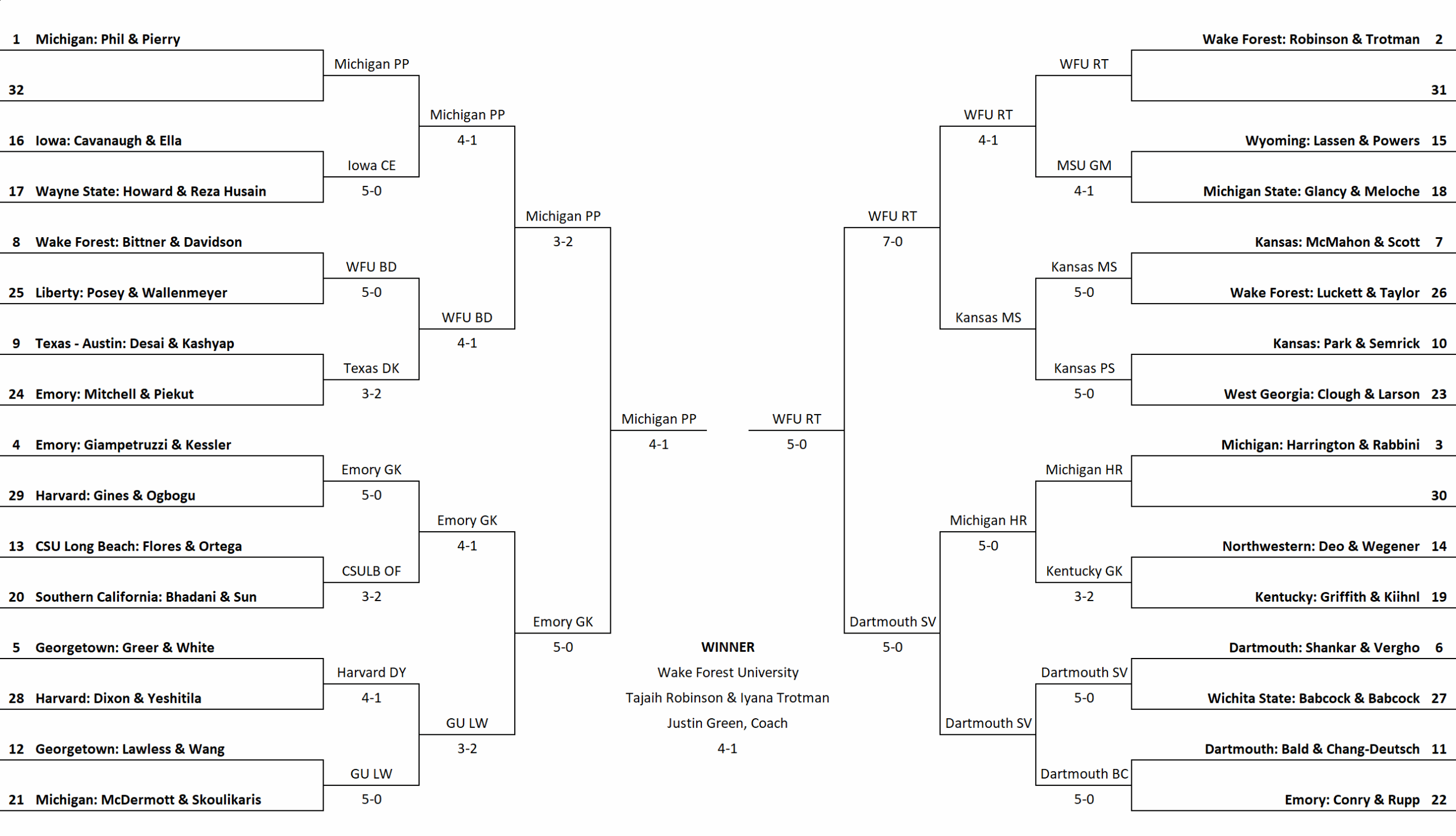 - Wake Forest: Ana Bittner & Ari Davidson (57)